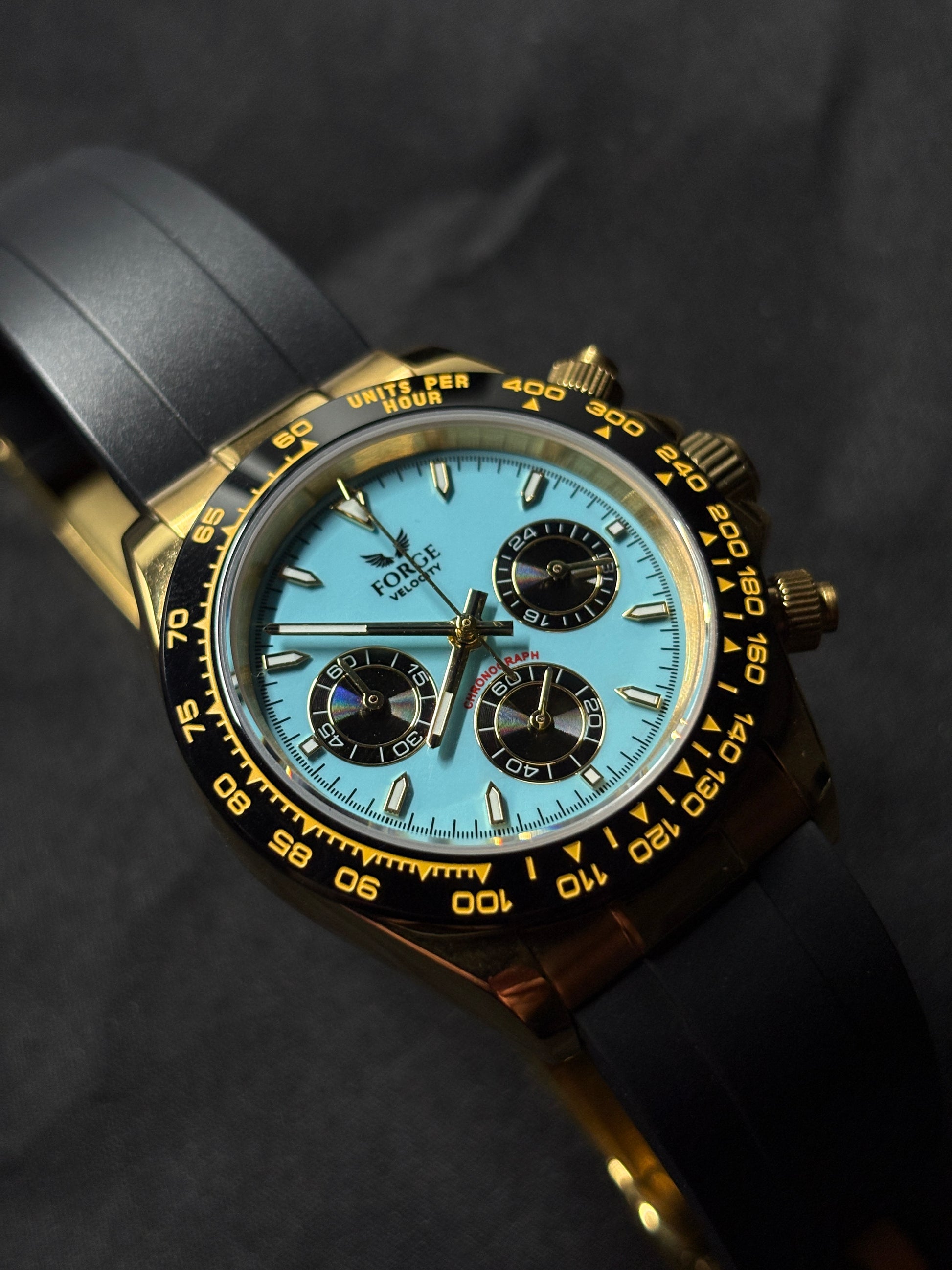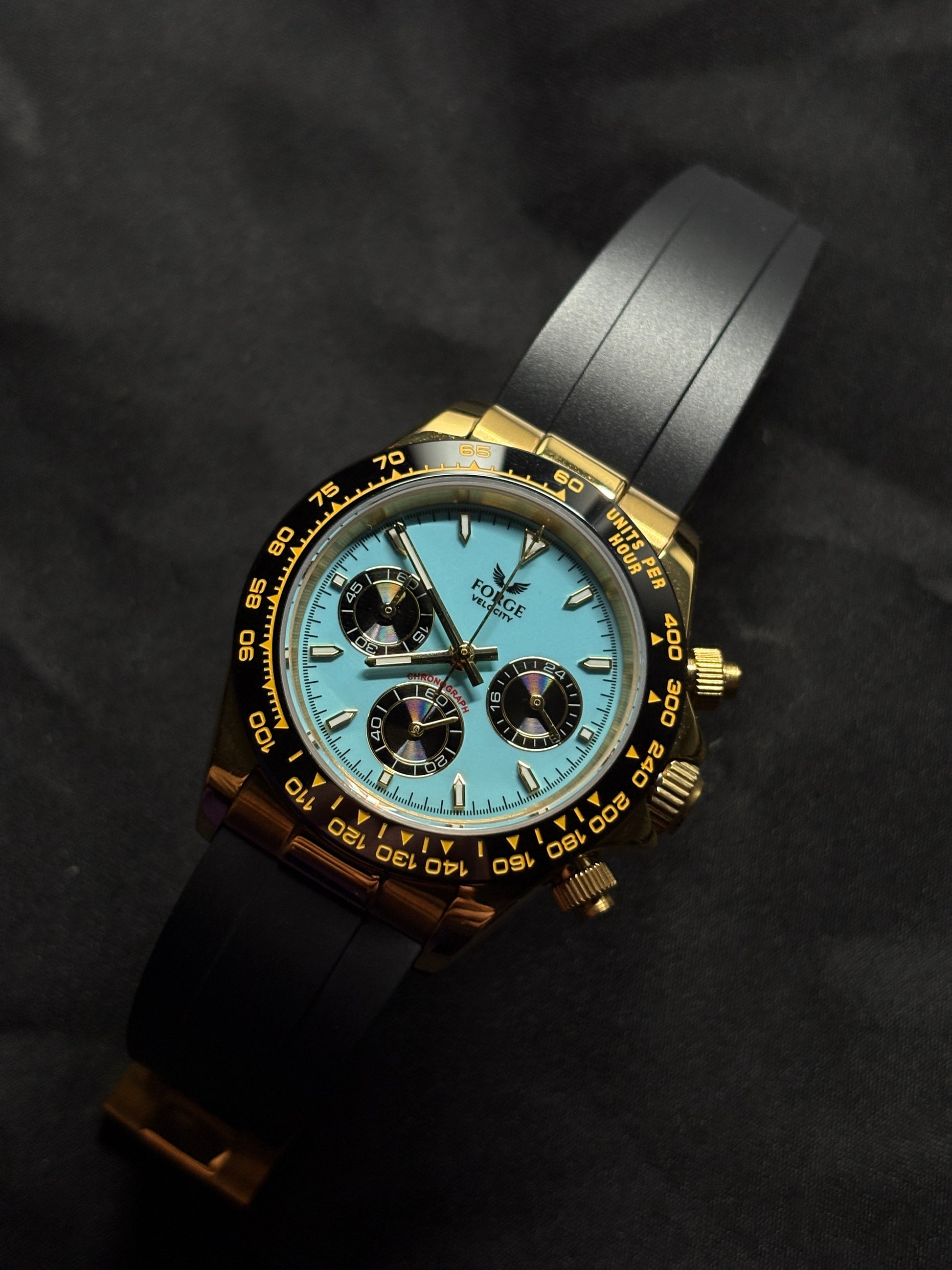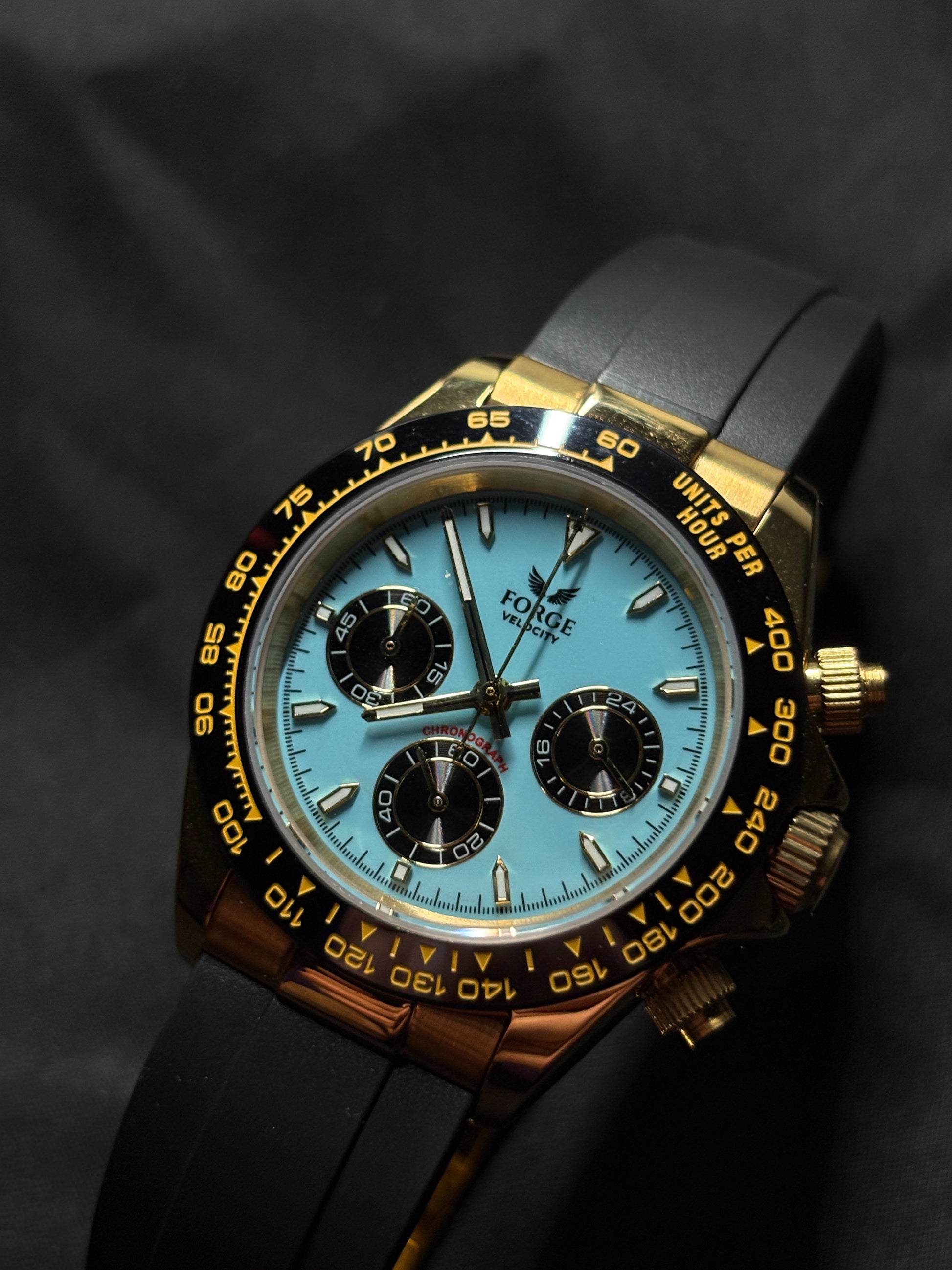 316L Stainless Steel Case, Scratch Resistant Sapphire Crystal, 40mm Diameter and 13mm Thickness, VK63 Quartz Chronograph Movement, 3 Subdial Chronograph (60s/60min/24hr), Black Sweat-Resistant Silicone Band, 30 Meter Daily Water Resistance. Handles Splashes and Rain.